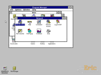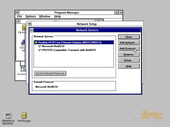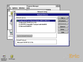 We'll also need the ethernet adapter drivers, such as the Realtek RTL8139 drivers I suggested before. You'll have to find the correct drivers for your Ethernet adapter. As I mentioned before the VOGONS Vintage Driver Library is a great place to find drivers. First we'll install the Ethernet Adapter drivers, to do that we go back to the Program Manager and in the Network Group we will go into Network Setup.